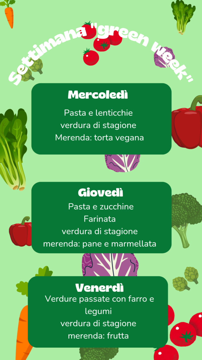 La Green Food Week è un’iniziativa Green School che ha l’obiettivo di diffondere un’alimentazione a basso impatto ambientale attraverso la proposta di menù in cui i legumi sono i protagonisti del pasto. Come scuola dell’infanzia abbiamo deciso di partecipare a questa iniziativa modificando il nostro menù!