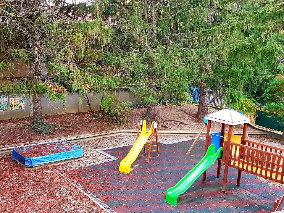 Grazie all’Associazione “Amici dell’Asilo” è stata realizzata, in giardino, sotto ai giochi (altalena, scivolo, castello) una pavimentazione antitrauma.